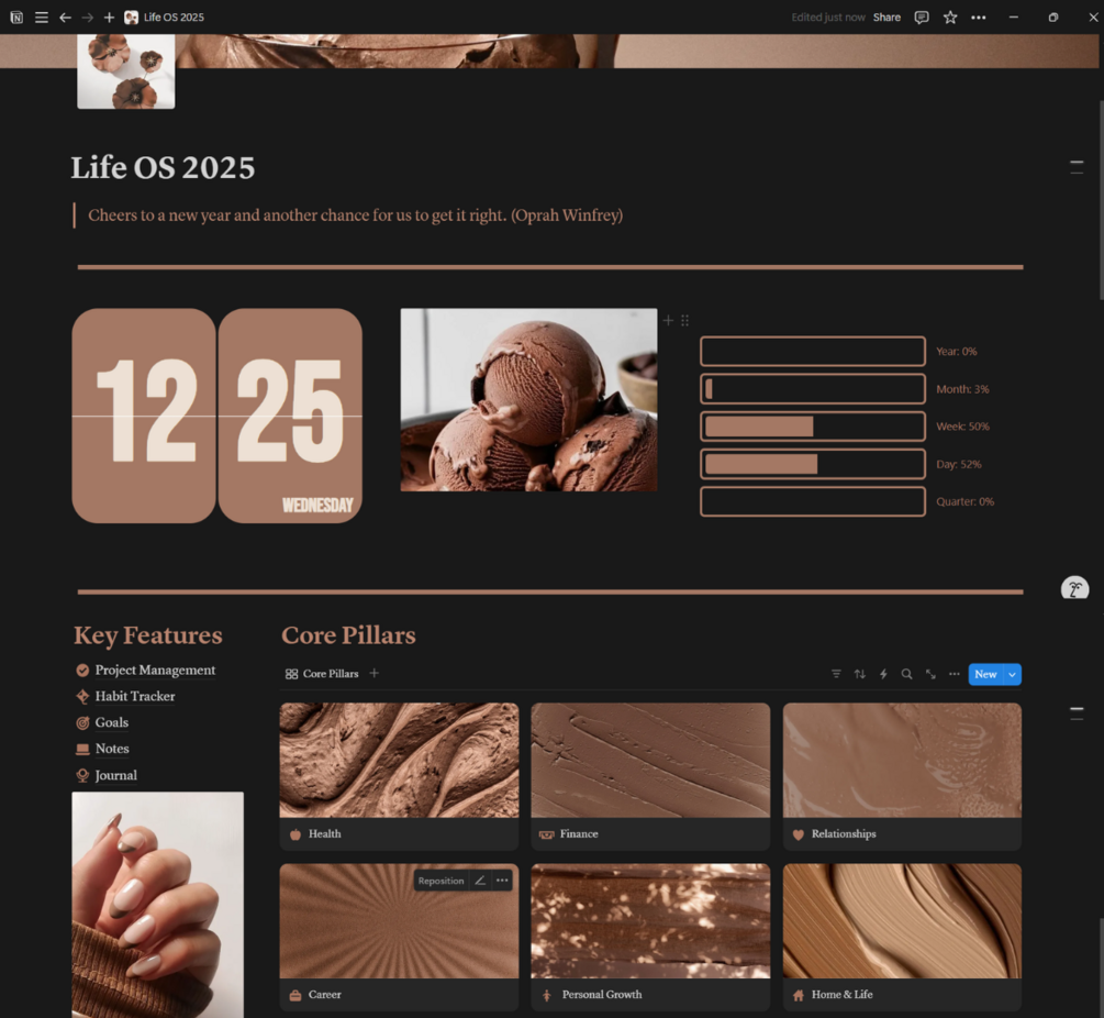 Take control of your life and achieve your goals with this all-in-one Notion template. Designed to streamline every aspect of your life, from career and personal growth to home management and relationships, this system provides a powerful framework for organization, productivity, and self-improvement. Start living your best life today.